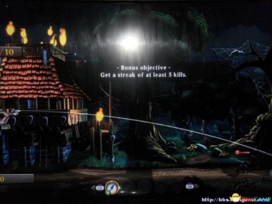 step1.利用森林小屋上的弩车对饿狼进行攻击,并且无法购买士兵出战。而这次的敌人就只有饿狼一种,推进速度快是其主要的特点,另外(非爆头攻击)起码要两箭才可以击杀。所以玩家瞄准行进中的饿狼要把抛物线的落点定在饿狼的身前,方可击中目标。此外,可以按Y键召唤出Gareth先生,使用Gareth先生对已经入侵、攻击森林小屋大门的饿狼进行清除。