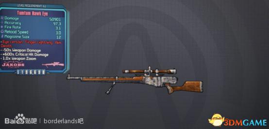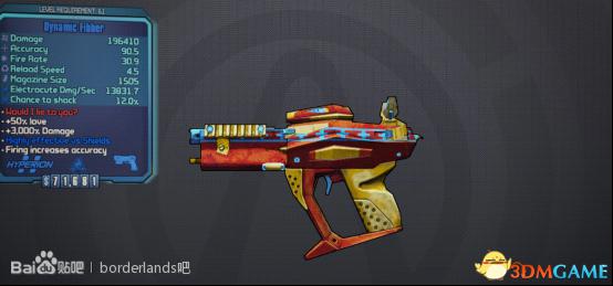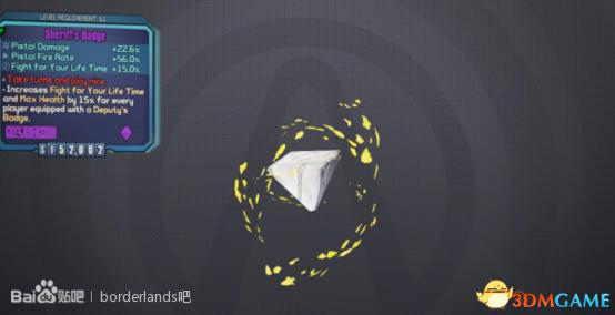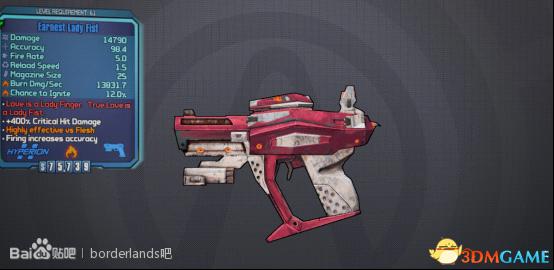 Lady Fist,火石镇支线任务Uncle Teddy奖励,红字效果为400%的暴击伤害和更大的弹夹,更快的子弹飞行速度等特性。该枪手感出色暴击杀伤力巨大且容易入手,玩家唯一要客服的就是Hyperion枪械所独有的越打越准的特性,即做好开头几枪的压枪。在此基础上圣物方面推荐选择警徽Relic。(Sheriff’s Badge)