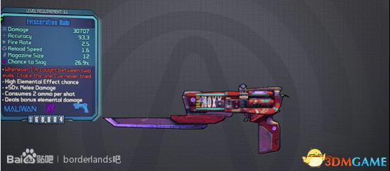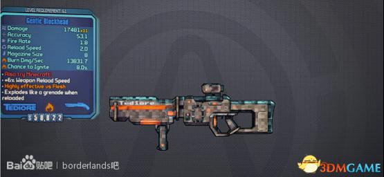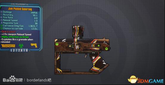 传奇版Tediore 手枪,玩家喜欢称之为回旋镖,其实要讨论这把枪的弹道完全可以另开一贴,这里长话短说。既然叫回旋镖,这把枪的弹夹就不是笔直的朝敌人飞去的,而是呈一个椭圆形的回旋路径,如果场地没有敌人则自动飞回玩家扔出去的点,如果有敌人,则自动跟踪回旋路上最近的敌人。由于很多玩家掌握不好弹道经常弹夹空爆或自爆遂称之为吭爹。但该枪其实拥有砸枪厂所有枪械中最高的砸枪伤害,看下面的视频演示就可见一斑。