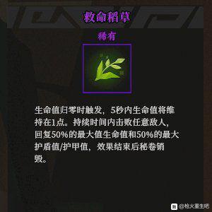 在《枪火重生》这款游戏中,有很多的小伙伴对于这款游戏中的救命稻草这一秘卷的效果很是好奇,同时也想要知道该秘卷到底要怎么搭配比较好,玩家“49475147”带来了《枪火重生》救命稻草秘卷组合推荐,一起来看看吧。