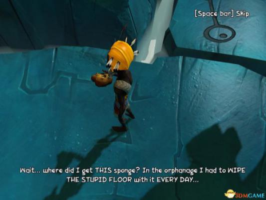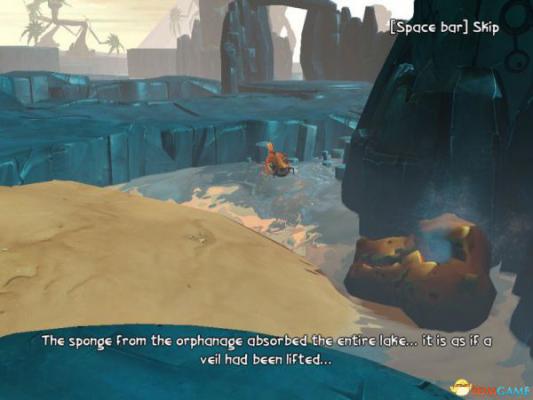 step2.把海绵扔到头骨杀手鱼的湖里,海绵把湖水都吸干了。此时,头骨杀手鱼会逃跑至前方的石墩椚前。