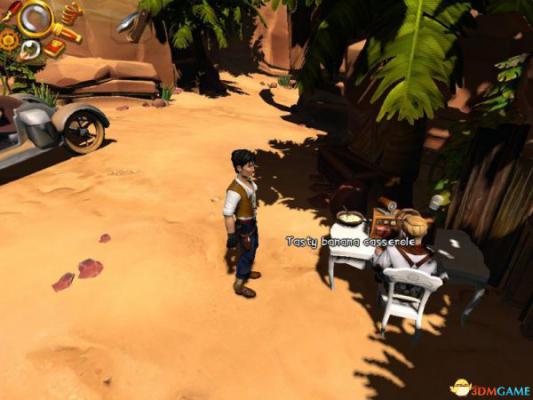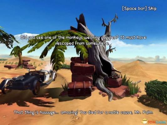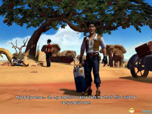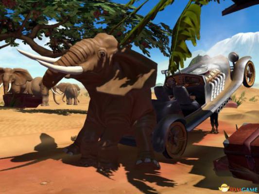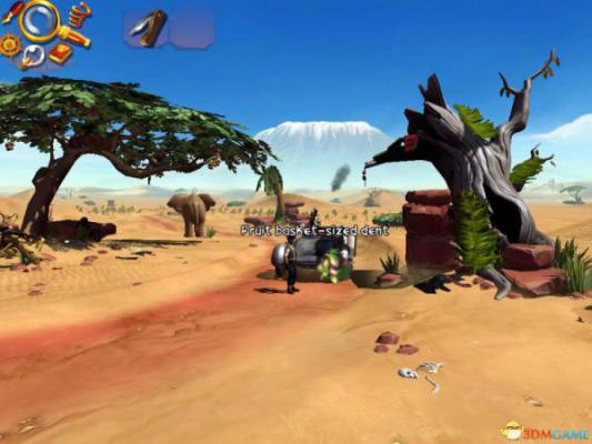 step18.弄晕了猴子过后,杰克捡起地上的无花果,把无花果都发在车尾的凹陷处(fruit basket-sized dent,如果只是点选车辆是没有效果的),大笨象就会跟着车辆一路跑。