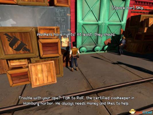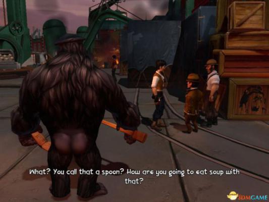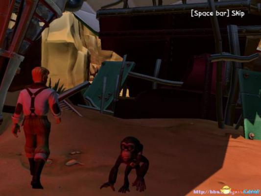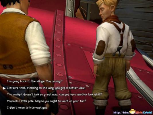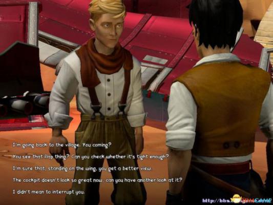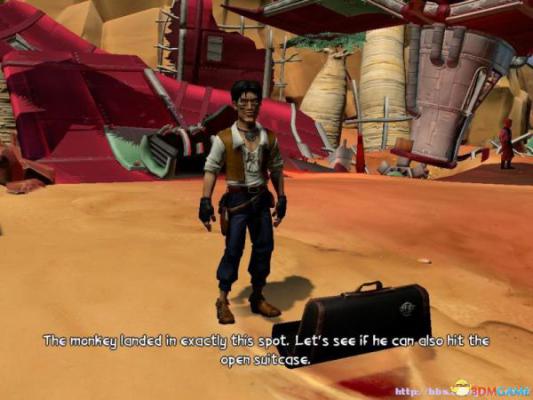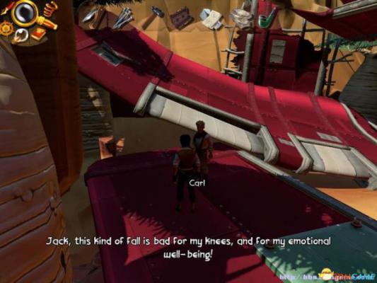 step11.继续与卡尔对话,继续选择“you see the flap thing?……”,使其回到内副翼上,然后跑到内副翼跟卡尔对话,选择“the cockpit doesn’t look so great now,can you have another look at it(驾驶舱还想有些问题,不如你去瞧瞧吧)”,卡尔就会来到中部,把那只猴子吓走,因为杰克站在了内副翼上,所以猴子只好跑到机翼上(弹射器)。