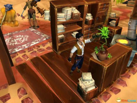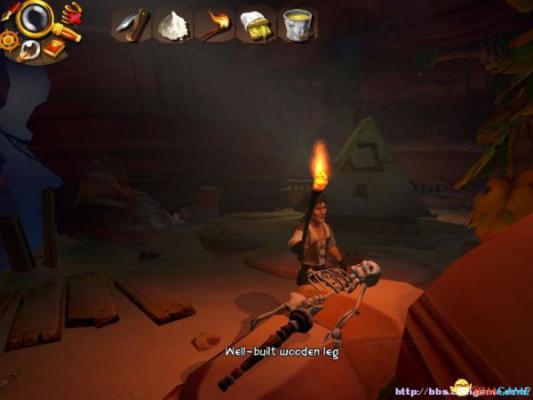 step21.回到村庄,进入物品栏,将无花果、树皮、红斑叶都放进之前买来的碗里,用锤子研磨,制成火焰犀牛。杰克马上就试了一吓,马上就嘚上洗手间,原来这根本不是什么增加功力的秘药,其实是泻药(留意下图物品栏,如果无法点选物品栏后面的物品,请按放大镜右边的“←”箭头;另外,去了一趟洗手间,烟斗就不见了……烟斗可以止泻?)。