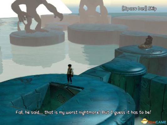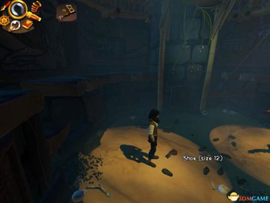 step8.来到“T”字道路,右侧带有一嗰地板机关的平台,把巨大的鞋子放在地板机关上,中间就会打开一嗰“深井”,杰克纵身跳了下去。