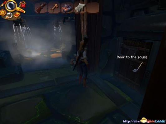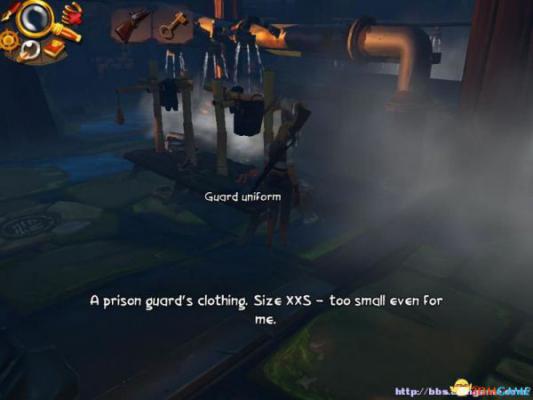 step1.进入浴室后,全身赤果的守卫看见阿曼达个个都转头就跑。就在沙井盖附近,阿曼达可以在四周的衣架上捡取“守卫的衣服”(在中间大椅子的右侧)、“吊钱”(大椅子左侧吊架上)、“干净的毛巾”(右下方长板凳上)和“吸水海绵”(大椅子左侧吊架上)。