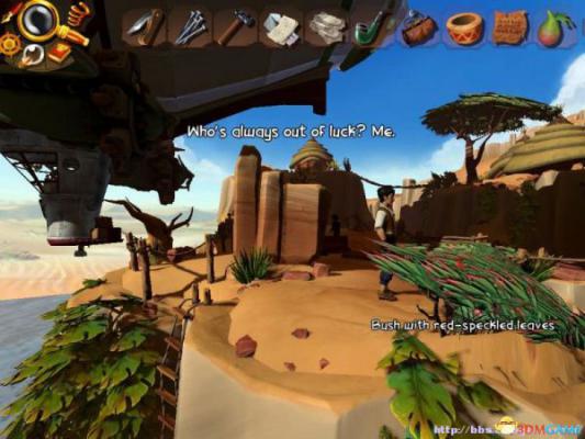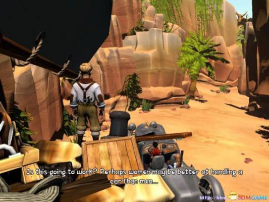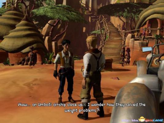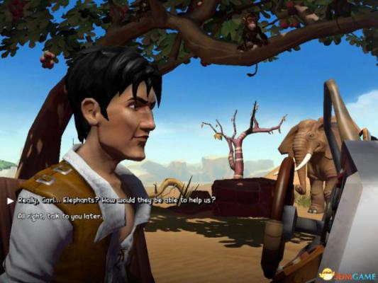 step27.因为之前已经用了猴子吓跑了矮个子泰利,继续与卡尔对话,告诉他可以上去看看飞艇了。卡尔就会甘愿把跑车送给酋长。