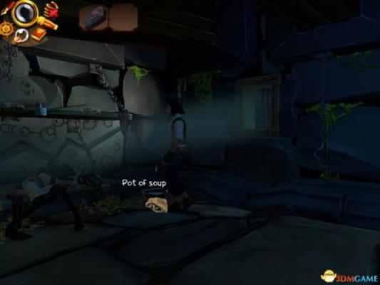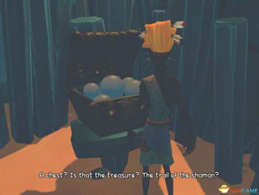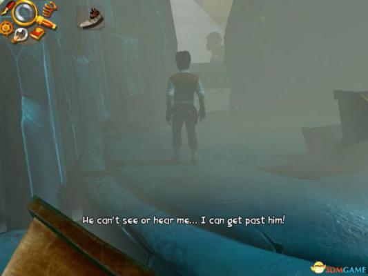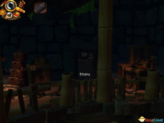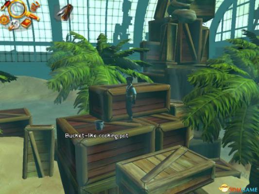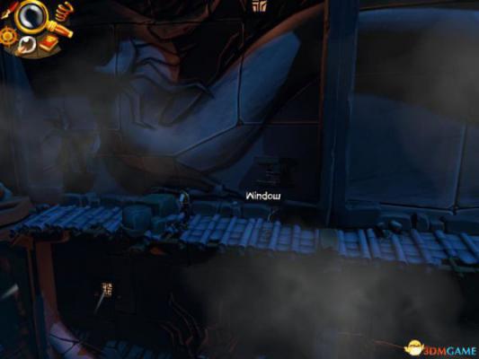 step7.在头骨杀手鱼使用装满迷雾(蒸汽)的宝箱,散出的迷雾阻挡了头骨杀手鱼的实现。然后在头骨杀手鱼跟前使用大喇叭,干扰他的听力。然后就可以绕过他,进入他身后的地带。