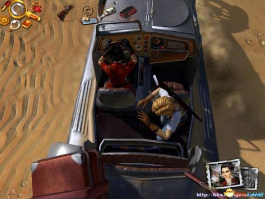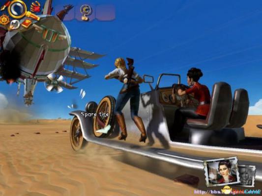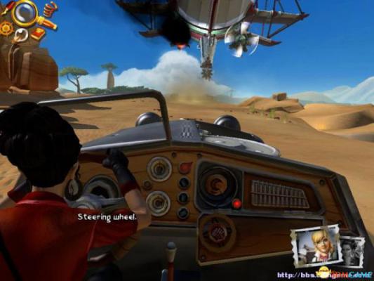 step10.矮个子泰利开始对着跑车射击,而且飞艇越来越快了。此时系统提示可以点击右下角的“图片”转换人物,现在转换操控伊娃,按动汽车右侧的收音机,与卡尔通话。询问卡尔为啥车辆龟速的原因,卡尔告诉伊娃,车辆是有二档的,现在伊娃是用最低档位行驶。随后拉动变速杆,提升到二档。