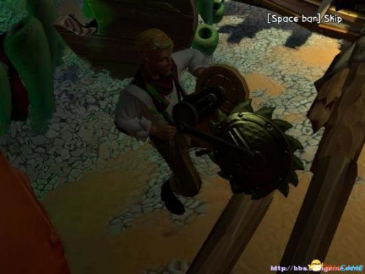 step22.走到井口边,触发剧情,此时从武斗场出来的头骨杀手会跑来井边打水喝。当其离开后,把火焰犀牛倒到小木桶里,下一次头骨杀手再次打水喝之后就会腹泻跑出村子右侧(骷髅船上方通道)的洗手间方便。