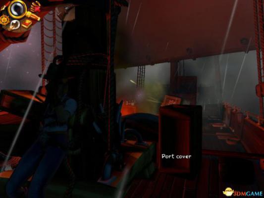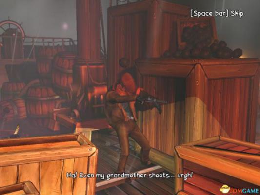 step2.用鼠标点击阿曼达左侧的场景,转移到左边的掩体,瞄准火焰上方的威士忌酒,引燃火焰至矮个子那洒满威士忌酒的甲板位置。(射击矮个子地板上的威士忌是无法产生爆炸的),爆炸将矮个子弹飞。
