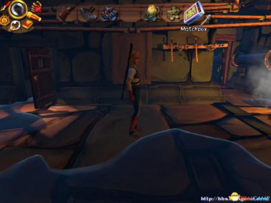 step5.回到守卫(储藏室)的楼层,利用进入储藏室的旁侧,用骨头勾到一嗰没有煤油的打火机,在物品栏中将油灯罐的煤油倒进打火机。