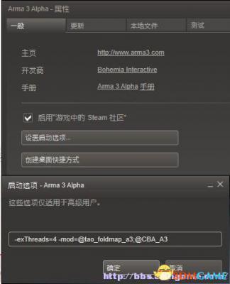然后我们以下面的附件mod为例子,下载后解压,将@tao_foldmap_a3和@CBA_A3两个文件夹复制到如: E:SteamSteamAppscommonArma 3中回到快捷方式属性中,在 "E:SteamSteamAppscommonArma 3arma3.exe"后空格一下,然后填上