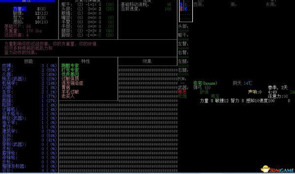 第3天早上,技能已经练成这样了,这还是在第一天就下暴雨的情况下,半天呆在房子里没出门呢。肉搏钝击闪避弓和火器生存都没有靠NPC学。弓术就靠弹弓打石子升级的,非常快。