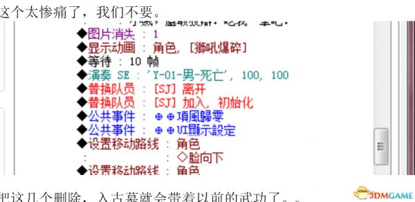 自宫的问题,找到葵花宝典,切到葵花宝典的事件页,发现在代码里面有个标红的自宫啥的,删除就可以了。第三种方法,是直接复制代码。找到葵花宝典事件,复制条件分歧下的如下代码。