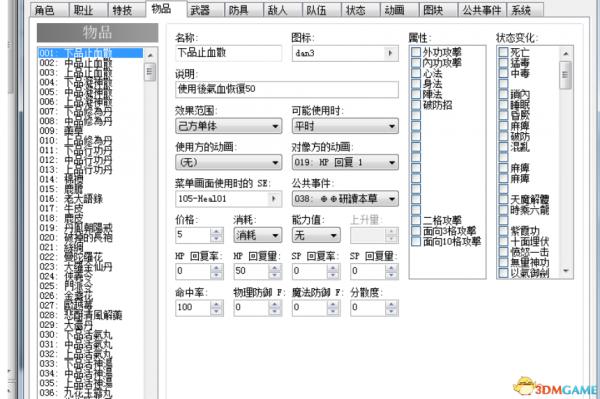 好,以后你就可以学习葵花宝典了。其中看到那个红色的变量了不,你懂得,注意适用的只是主角,队友的变量不是这个。第二,修改物品物品里面,你可以选择修改药物不消耗,这下你可以一直嗑药了。当然相应的你可以选择将普通药物修改成能力上升的效果。四维可以靠嗑药加满。对应关系在最后一页上面。