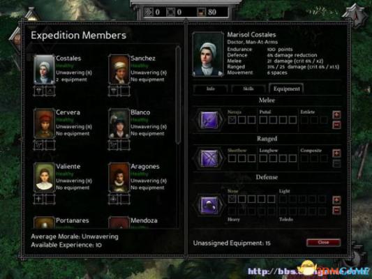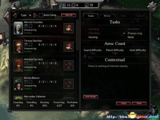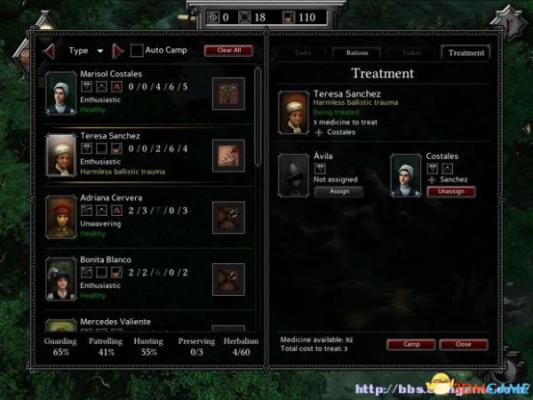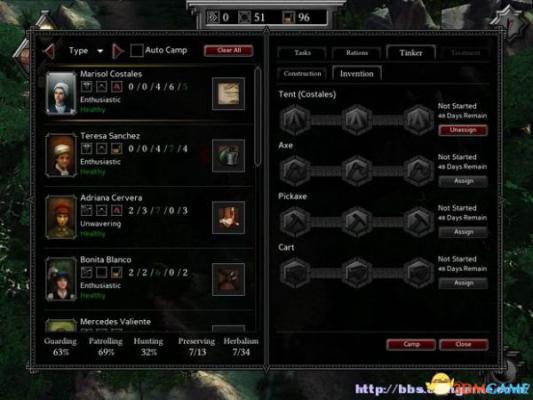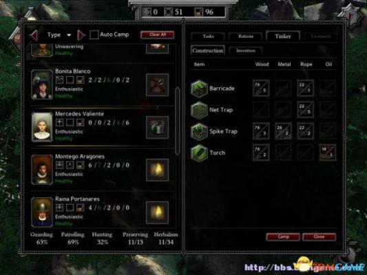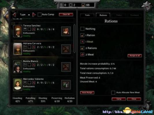 其实本作真正惹人眼球的地方在于扎营系统,这也是本作的魅力所在。玩家可以在行动点数内在野外的任意地方扎营。扎营时首先要确认每个人的工作,分别有:医疗(假如有伤病员的话),打猎(获取肉),回收猎物(将肉做成食物),制药(将药草做成药品,医疗伤病员需要药品),守卫(防止被偷东西),巡逻和制作物品(包括各类陷阱和各类有关扎营的升级,包括帐篷马车等等)。在确认好每个人的工作后又需要将食物分配给每个人,这里建议大家自动分配。