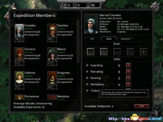 所以请谨慎选择升级。而升级的时候玩家有机会选择一项人物技能,然后会有三个技能点可以消耗,这技能点分别可以消耗在以下几处:守卫,巡逻,打猎,回收猎物,制药,以及制作物品。每个职业的偏重也各不相同,所以玩家需要合理搭配。