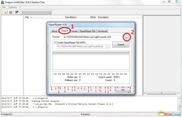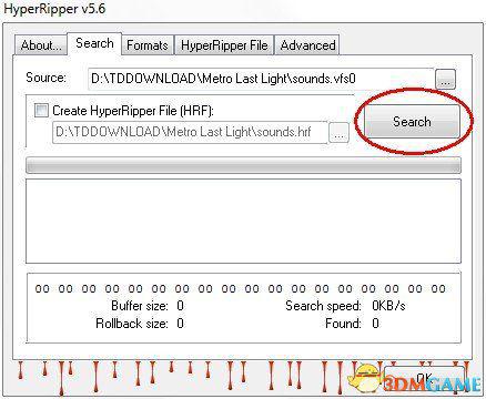 在 File 选项下选择 HyperRipper, 然后点 Search, 再点"...", 在游戏目录下找到sounds.vfs0