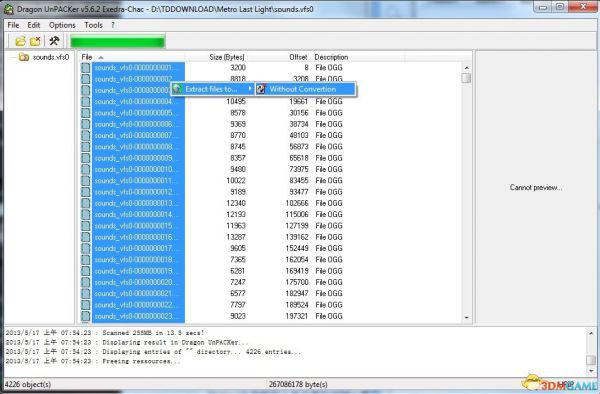 等搜索完之后点一下OK, 回到原来的界面, 就可以看到地铁全部4226个音乐文件, 全部选择, 右键, Extract files to..., Without Convertion, 然后选择你想放的文件夹