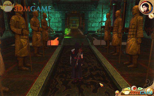 走廊里有道锁住的门,往西侧的走廊穿过去,经过一条山洞进入一座地宫,正中是一座高台,将墙壁两侧的机关推进去,之前走廊的栅门开启,这时大厅里出现九名兵马佣,它们是练功用的,是杀不光的,建议在这里将等级练到32级以上。