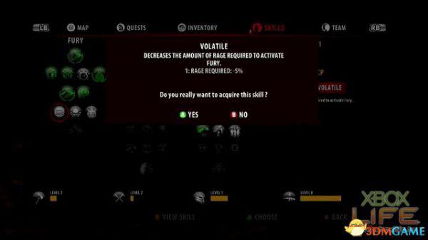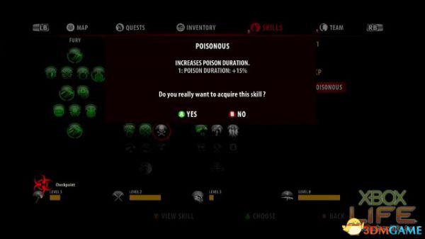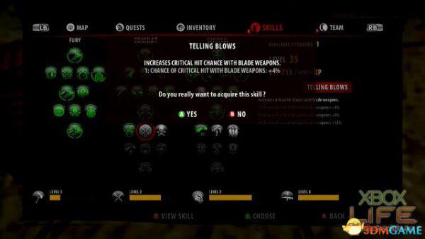 玩家在《死亡岛:激流》中只要完成任务或是击倒僵尸都能获得经验值,累积一定经验值就可以学习新技能。《死亡岛:激流》与许多游戏一样都采用循序渐进的技能树系统,所以玩家无法一步登天,必须先充实较基础的技能才能学到高阶技能。技能大致分成三类:强化「Fury(愤怒)」状态的「Fury」类、强化近战攻击的「Combat(近战)」类与提高生存率的「Survival(生存)」类,而每个角色的技能树都不太一样(例如我使用的「Xian」,她的近战技能清一色都跟刀刃类武器有关)。坦白讲笔者因为常常杀到眼红所以感受不到某些技能是不是真的有效,但还是推荐给大家一些自以为有用的技能。Choice Cuts(选择性断肢):攻击造成僵尸断肢时会得到额外经验值。
