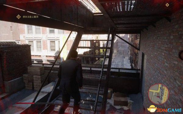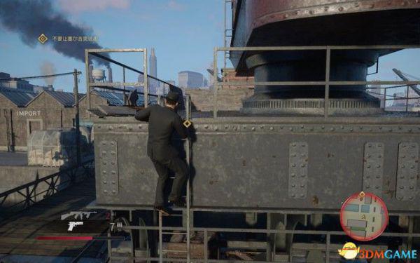 翻越护栏后潜行,等对面的守卫走掉后,借助箱子爬上屋顶。