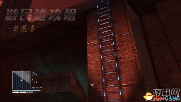 抵达之后从如图所示梯子爬上去,你会发现你到了一个很高的地方,不用怕,直接跳下去。然后下去到任务目标开启箱子,再跑回来。