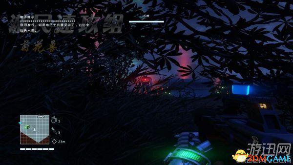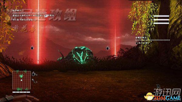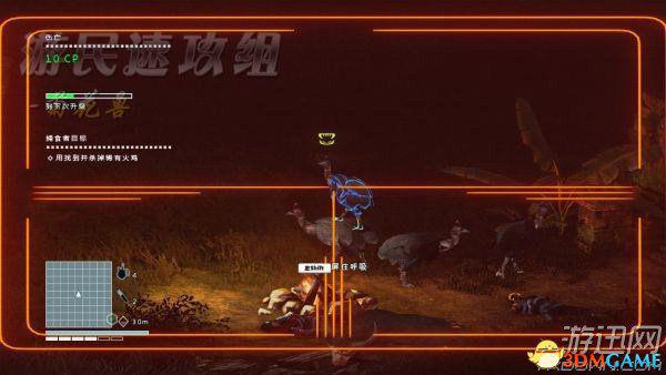在这里,任务目标,如左上角所示,利用电子心脏将恐龙引开,点G在途中两处电子心脏图标处投掷电子心脏,这时恐龙就会追过去,你可以肆无忌惮地在蹲伏状态 从他旁边走过去,即使它这时候变成了红色,也不是过来追击你的,而是过去吃电子心脏的。出来之后就速度跑到任务目标处,不过虽说是“速度”但是也别站起 来,站起来之后可以看到提示,血龙对于声音很敏感之类的话。