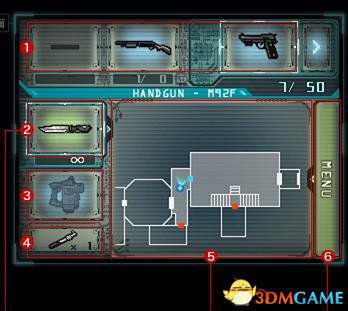 1、显示主武器列表部分。在本作中可以一次携带3种武器。最右边的武器为装备中的武器。如果点击没有选择的武器则可以快速地切换手中的武器;如果点击装备中的武器则为上膛。
