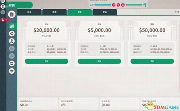 需要注意的是在财务页面,我们还可以贷款或者给动物园作宣传广告等。