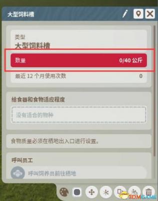 首先是食物与饮水,这里显示着所有与动物基本食物和饮水相关的设施,即饲料槽和水盆。