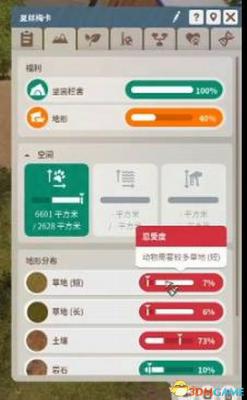 点击动物,在右侧的详细信息中点击对应的选项卡,即可查看动物对这些环境的需求。