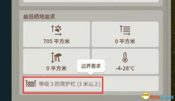 选择某种围栏时,我们可以在动物百科中的自然栖地页面查看某种动物对栖地边界的需求。