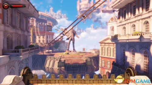 《生化奇兵:无限》中的天空之城哥伦比亚,就如同初代《生化奇兵》中的海底都市Rapture一般,拥有一个充满特色的完整世界观。游戏中以工业革命达到极致的1912年为背景,并融合了大量的蒸气庞克元素,复古与科幻的结合并没有让这座城市像是虚无飘渺的空中花园,熙来攘往的人群、景色丰富的街道、四处都能听得到的古老乐曲,以及各式各样的商店如书店、玩具店和酒吧等等,出色且详尽的游戏设定与美术设计反而让哥伦比亚看来更为立体且真实。