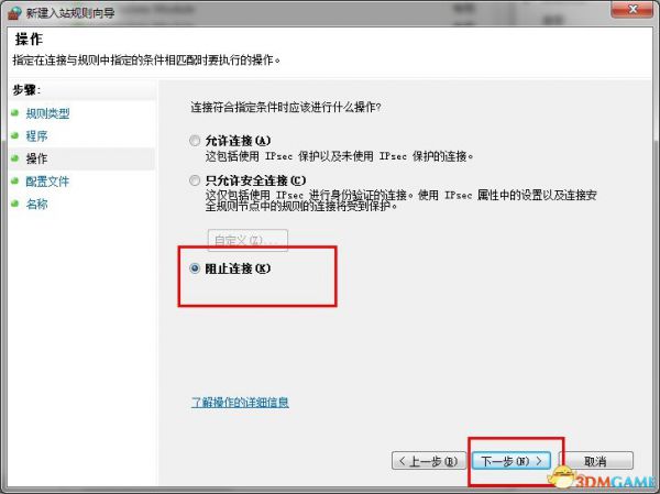然后把要禁止的3个程序一个一个添加上去,下一步选择阻止链接。