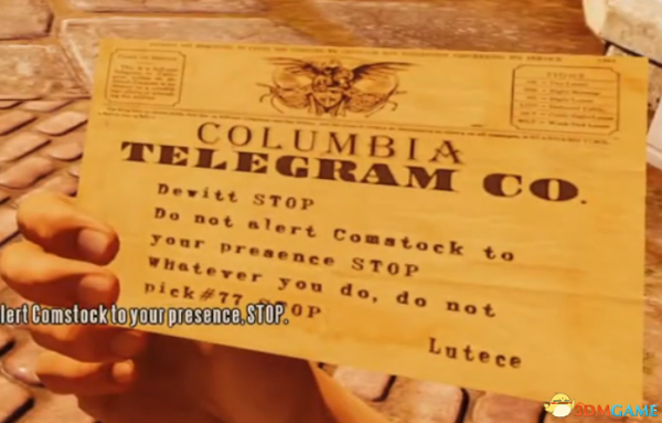 谁告诫Booker不要拿去77号棒球?其实就是Robert、 Rosalind兄妹两,其实他们并没有说,在Booker刚进入到Columbia后有个小男孩递来了一个电报(图10-1),电报上写着:Columbia 电报有限公司-Dewitt先生停下来,不要因你的行为而让Comstock先生察觉了,无论你做什么都好,不要拿起#77,停。署名,Lutece。我们注意到了“#77”和最后“STOP”之间是有一个“逗号”隔开的,这就意味这“#77”是一样物品,是一样Booker禁忌的物件。而且电报当中也明确指出,Booker是可以在Columbia内做任何自己想做的事情(也就是到游园里玩小游戏喇)。但是,如果触碰到带有“#77”的物件,就会引起 Comstock的警惕。