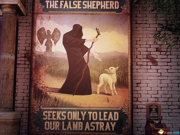 “羊羔”(lamb)和“牧羊人”(shepherd),我们最初就是在一幅海报(图1-1)中了解到,内容是:那个虚伪的牧羊人引领着羊羔误入歧途。从海报内容上我们就得知“牧羊人”与“羊羔是有一定的“交涉”,这种“交涉”不单止是语言的沟通而且还会存在着一定时间内的“合作”。那么这里的“lead”是持续性的引领。另外,在(约—29)中写道:当主耶稣来到地上的时候,施浸者约翰指着祂说:“看哪,神的羔羊,除去世人之罪的!”。从《生化奇兵3:无限》的宗教文化背景来看,游戏内的宗教文化是与真实的宗教文化相吻合的,那么就意味着这只误入歧途的羊羔便是“基督”。另外就是“牧羊人”一词,牧羊人本应是看护羊群的责任人,而他却刻意地教唆“羊羔”往深渊走去,显然这是不符合利益守恒定律,而《约翰福音》亦提及了:牧羊人乃世人之守护神。牧羊人必须时刻警觉地守护着羊群乃至一只出生的羊羔。