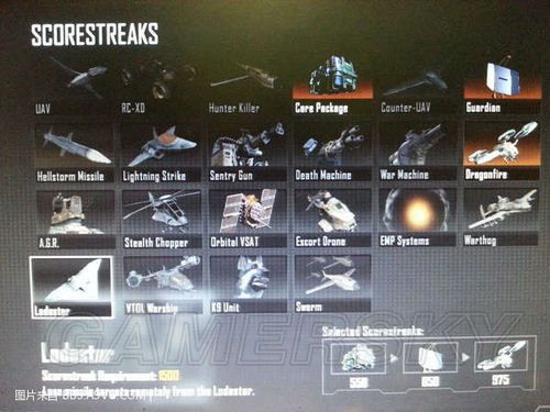 第三行:AGR(1000点,天上掉下个可以使用的机器人),隐形直升飞机(1100点,不会显示在敌人的地图上机枪支援),间谍卫星(1200点,可显示敌人的位置以及视角的朝向,不会被击落),无人驾驶直升飞机(1250点,呼叫后自动在你指定区域巡逻掩护机枪支援),EMP(1300点),war thog(1400点,喷气式的飞机近距离空中支援地面使用机枪导弹俯冲同时射击掩护)