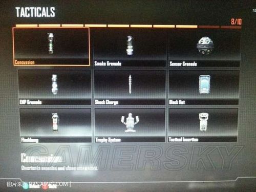 第一行:震撼弹,烟雾弹,动作感应手雷