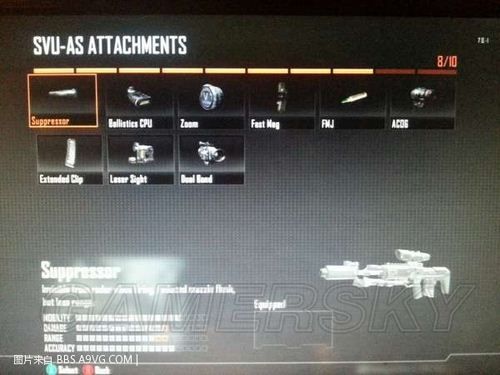 第一行:消音器,Ballistics CPU(就是瞄准时候减少抖动的),zoom(按RS时会提供远近两种距离瞄准),双弹夹,子弹穿透,Acog
