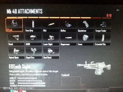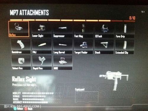 第二行:target finder(目标标记目镜)当敌人在目镜时会提醒红色方框标出,镭射瞄准器(提高盲射准度),单发连发转换装置,大红点,消音器,子弹穿透