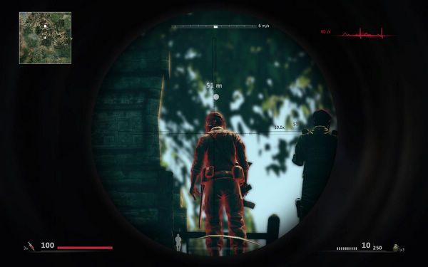 在简单和普通难度下,瞄准准心附近会出现一个红圈,这是提示玩家在受到风和空气阻力等因素影响后子弹命中的真实位置。但是在最高难度下是不会出现这个红圈的,一切要靠玩家自己观察风向计自行判断。