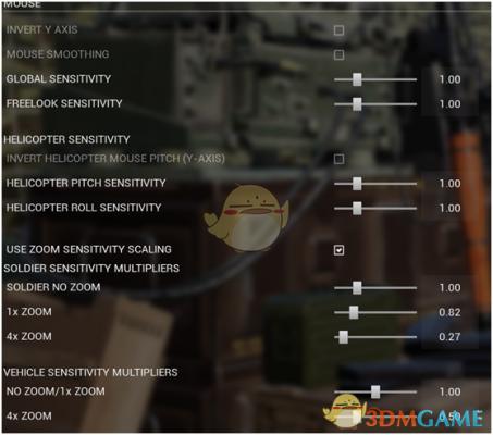 鼠标灵敏度设置:默认1.0,打上勾可以分别调节腰射/开镜的(1X是1倍放大,4x是4倍),从上往下依次是直升机、步兵和载具炮手。压枪有困难的推荐把灵敏度调低一点。