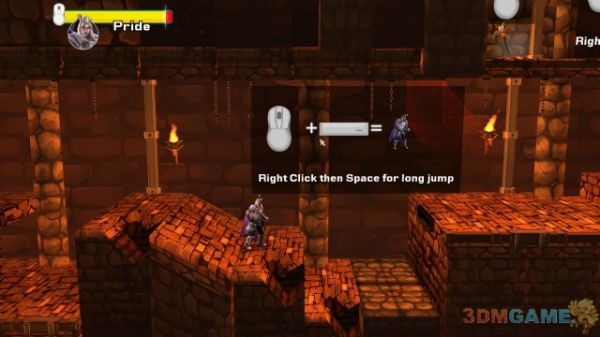 PRIDE的一个比较重要的特技就是冲刺跳跃;SPACE+鼠标右键组合即可释放。该技能在后期是比较重要的,尤其是跳跃较宽区域的障碍之时,玩家需要释放该技能来跳到较远的高处