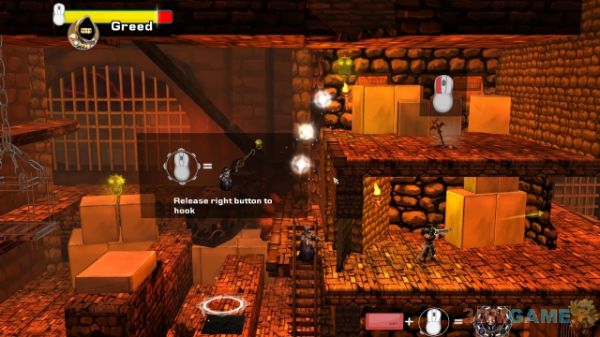 之后则是我们的贪婪,GREED. GREEDd的技能在于可释放锁链勾住各个区域的挂钩来飞跃前进,当然某些区域的机关门也需要使用锁链勾住挂钩才能打开