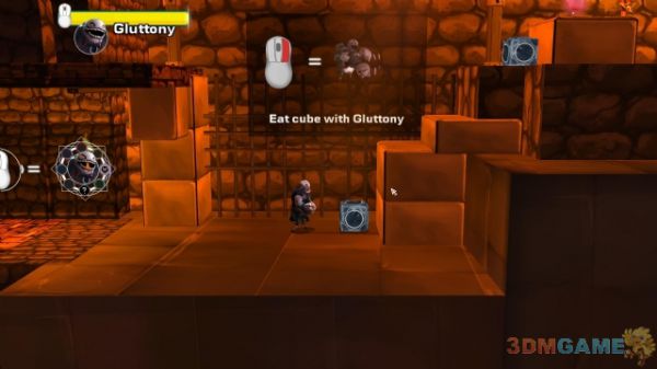 来到下一个区域。激活第三个角色,GLUTTONY。这个家伙正如其名,就是个贪吃鬼。该人物的技能可以吃掉一些较小的道具,如本关所示的水晶块