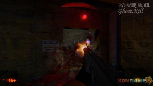 从电梯出来来到警卫室外面,这个博士逃走时触发了地雷,爆炸后前方的大门自动关上了,门的右侧有个按钮,打碎玻璃点击按钮可以开门。进门有两个红色的镭射,一旦碰到就会触发自动机枪,直接打烂对面的自动机枪这镭射就会消失。