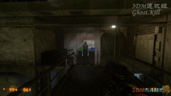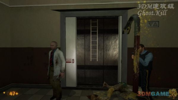 楼梯上又遇到两个人,跟他们一起杀到这个电梯门口,加速跳到对面的梯子上,爬到最高层,打烂最高层电梯的天窗,进入电梯里过关。