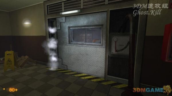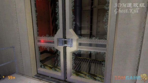 这种门蹲下穿过破碎的玻璃可以通过,虽然看上去空间不够大。来到电梯前按按钮使用,电梯会掉下去,门上的玻璃会破震碎,穿过这扇门从梯子爬到楼上,遇到一个带枪的警卫。